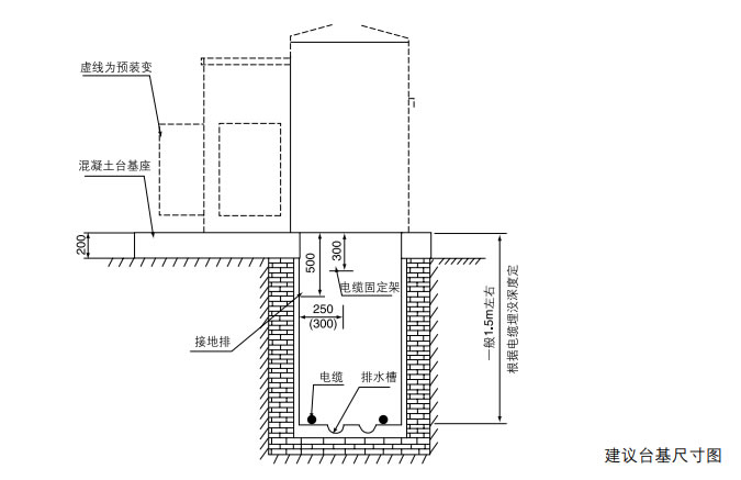 組合式變電站安裝在水平混凝土臺面上,臺面應(yīng)保證承受其重量.建議臺基尺寸 ( 見下圖 )