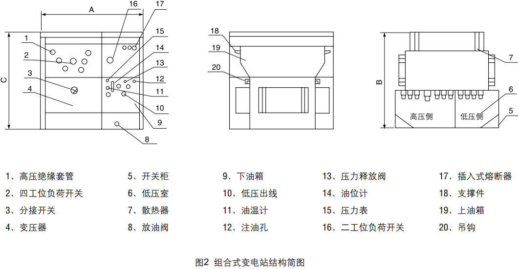 產(chǎn)品結(jié)構(gòu)特點(diǎn)(原理圖見圖1、結(jié)構(gòu)圖見圖2) 變壓器器身與高壓開關(guān)設(shè)備分油箱裝配,兩者僅電氣連接而油相互隔離。帶電操作負(fù)荷開關(guān)產(chǎn)生的電弧只能使負(fù)荷開關(guān)油箱中的油變黑甚碳化而不影響變壓器中油的質(zhì)量。損耗小、過載能力強(qiáng)。可用于環(huán)網(wǎng)供電、雙電源供電或終端供電系統(tǒng)中,供電方式轉(zhuǎn)換方便、運(yùn)行可靠。 本產(chǎn)品具有缺相保護(hù)裝置,當(dāng)缺相時(shí),可自動(dòng)同時(shí)斷開變壓器的進(jìn)線負(fù)荷開關(guān)和低壓側(cè)斷路器(總開關(guān)),也可只斷開高壓側(cè)負(fù)荷開關(guān)或低壓側(cè)斷路器。 |